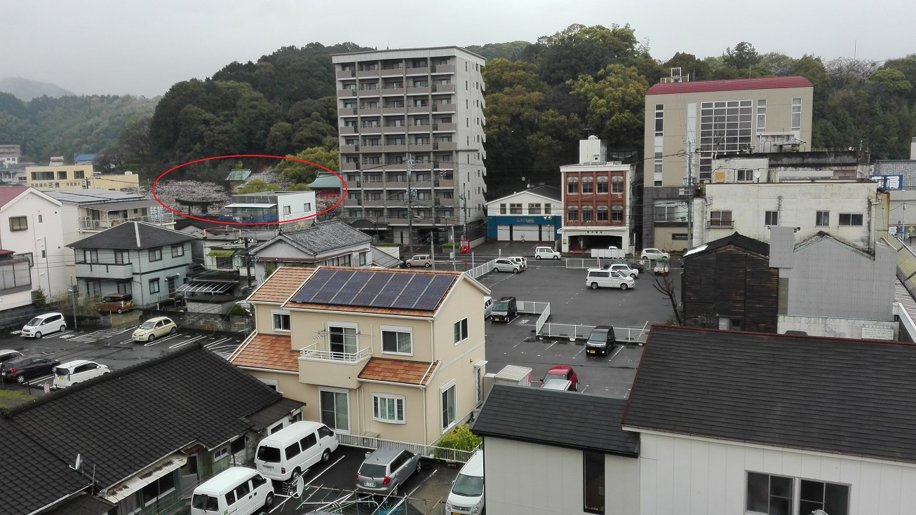 左奥の赤丸が今山八幡・今山恵比寿神社